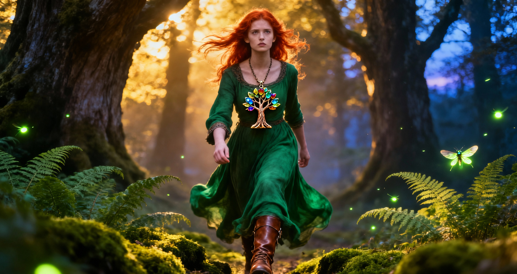 Young redhead woman in a mystic scene. she is wearing boots, a medieval gown and a detailed tree-shaped amulet with multi-colored gemstone leaves and branches, shimmering under soft spotlights. in a magical forest.