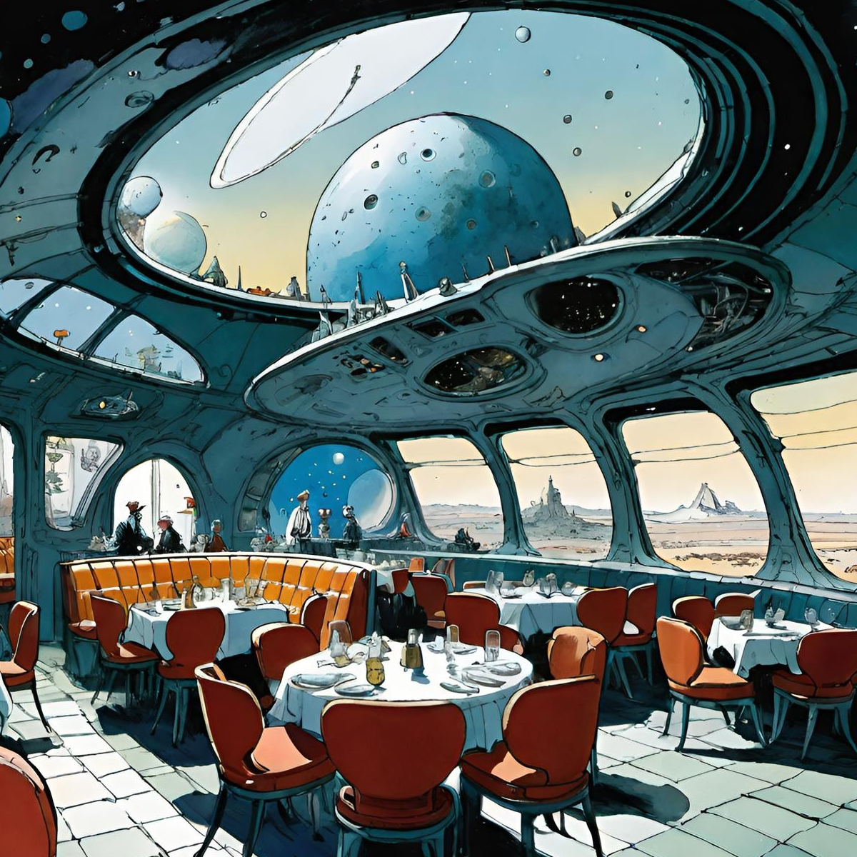 Ich betrat das außerirdische Restaurant ‚Glass House‘ und fühlte mich sofort von der Atmosphäre überwältigt. Das Interieur schien direkt aus einem Science Fiction-Film zu stammen, mit leuchtenden, organischen Formen, die sich um die Wände wanden. Ein sanfter Schimmer lag über allem, der mich daran erinnerte, dass ich weit von meiner Heimat entfernt war.